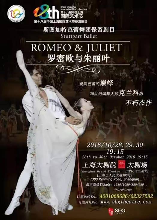 第18届中国上海国际艺术节 德国斯图加特芭蕾舞团 《罗密欧与朱丽叶》 演出信息 时间:2016/10/28-10/3019:15 地点:上海大剧院-大剧场 票价:¥80(公益票)、280(售罄)、480(售罄)、680、880、1080、1280 编导:约翰·克兰科 作曲:谢尔盖·普罗科菲耶夫 舞美/服装设计:尤尔根·罗斯 首演于:1962年12月2日